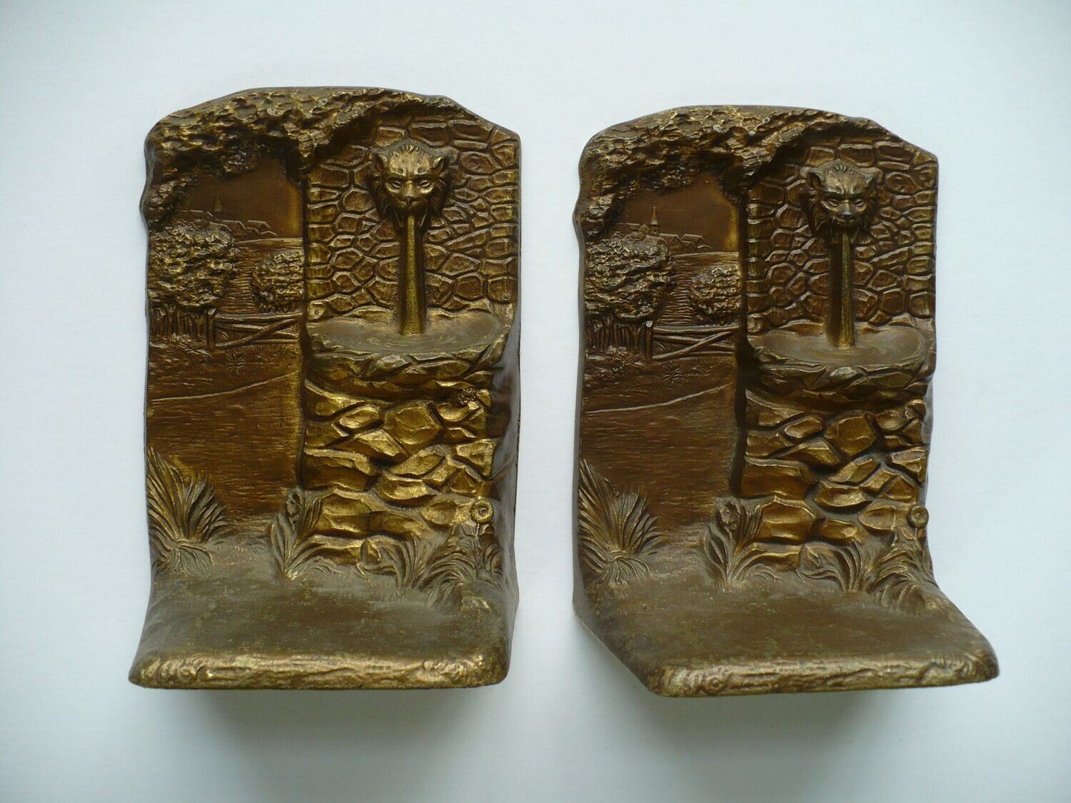CIRCA 1920'S JUDD COMPANY BRONZE LION HEAD FOUNTAIN LANDSCAPE SCENE BOOKENDS