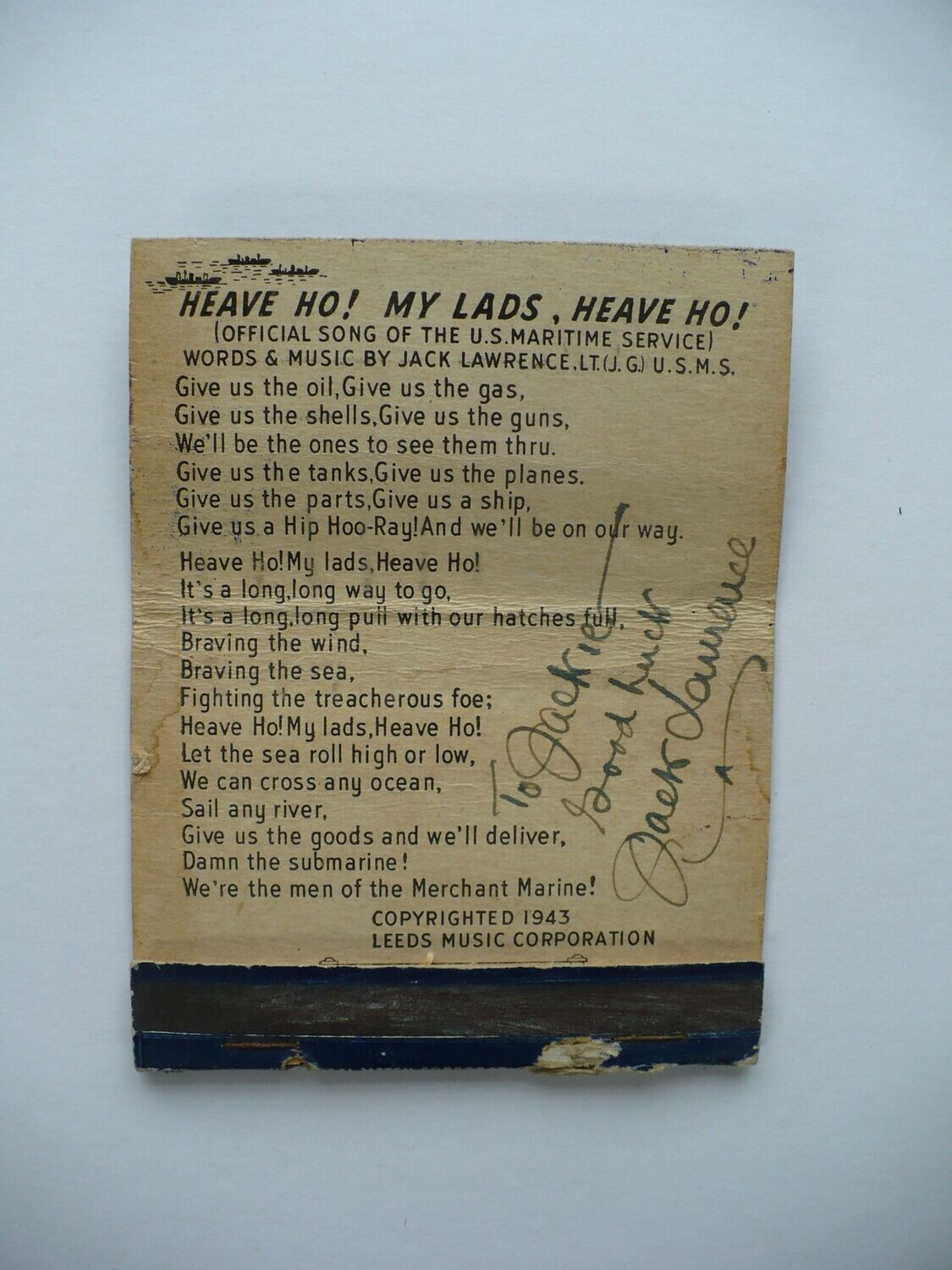RARE MUSIC SONGWRITER AUTOGRAPHED JACK LAWRENCE WWII MERCHANT MARINE SERVICE MATCHBOOK